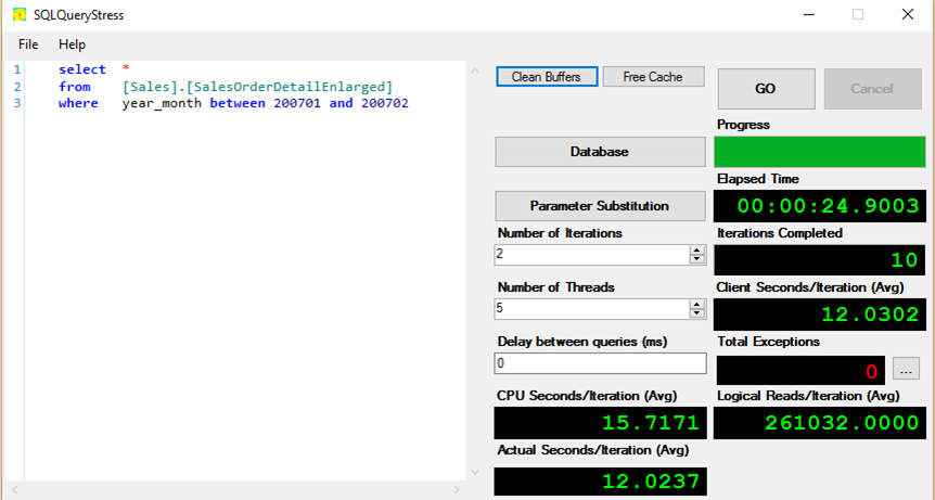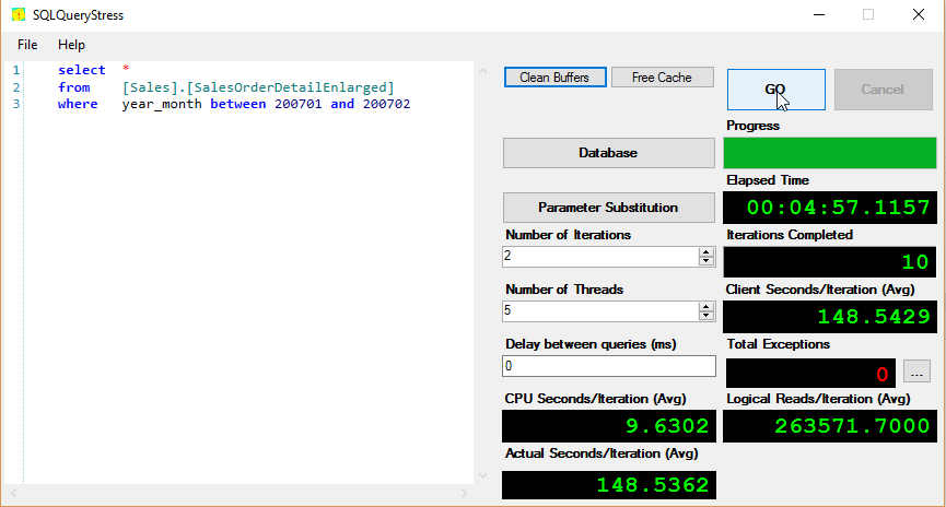 After this, I used a tool written by Mr. Adam Machanic(b|t) called SQLQueryStress. This lovely tool allows you to span the same query across multiple SPIDs and run several times. In each of these tests, we are running 5 iterations twice.