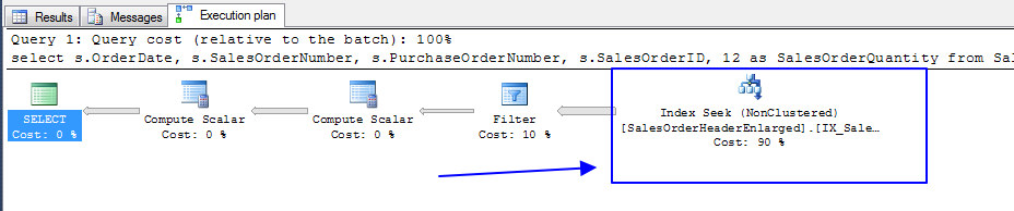 In the execution plan, we see that the index is being scanned. For a small index, this may not be much of an issue, but this will not scale well. Notice the high about of logical reacs and read-ahead reads. Both are around 50000. An elapsed time of almost 10 seconds. For 35000 records, this is quite extreme.