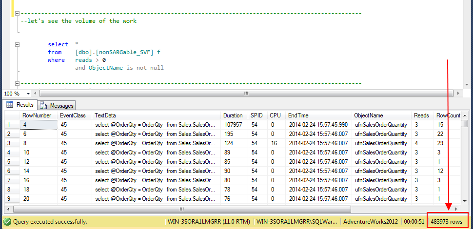 In the execution plan, you will see an index seek. This is what you would think you would want. The execution plan does not show the dark side of the story. To show this, I have ran a trace. You will notice that to obtain 476 records, the function was called 483973 times and ran for nearly 2 minutes. Total reads against the database, 1482949!
